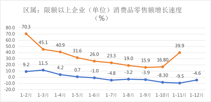 三、区属限额以上消费品零售总额完成12.16亿元,同比增长39.9%,全口径限额以上消费品零售总额完成108.97亿元,同比下降8.3%。
