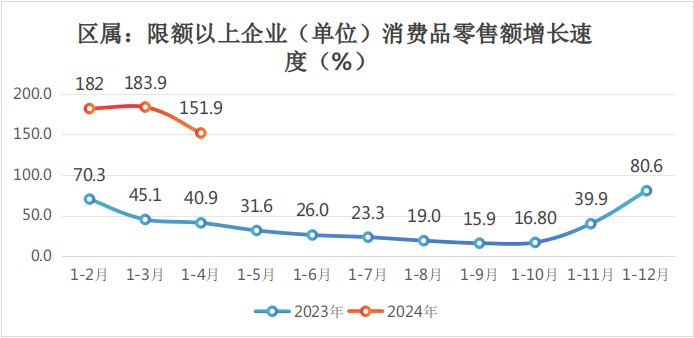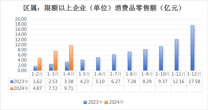 三、区属限额以上消费品零售总额完成9.71亿元,同比增长151.9%,全口径限额以上消费品零售总额完成49.55亿元,同比增长9.1%。
