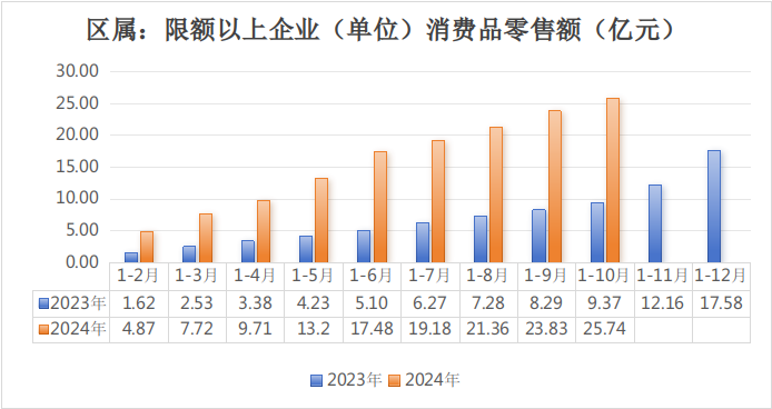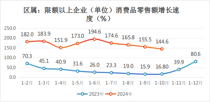 (三)区属限额以上消费品零售总额完成25.74亿元,同比增长144.6%;全口径限额以上消费品零售总额完成139.67亿元,同比增长21.6%。