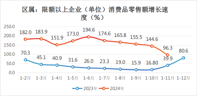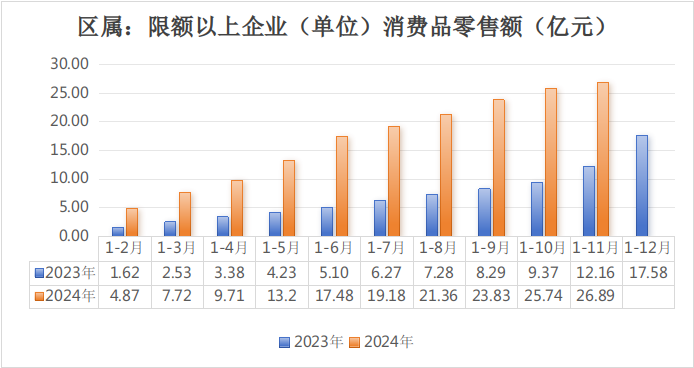 (三)区属限额以上消费品零售总额完成26.89亿元,同比增长96.3%,全口径限额以上消费品零售总额完成153.66亿元,同比增长18.5%。