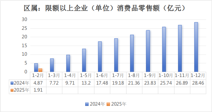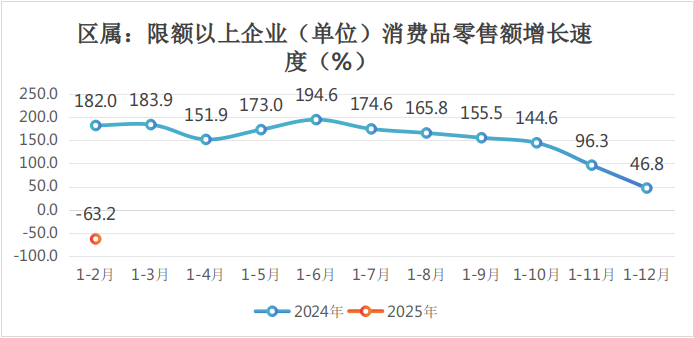 (三)区属限额以上消费品零售总额完成1.91亿元,同比下降63.2%,全口径限额以上消费品零售总额完成20.79亿元,同比下降10.1%。