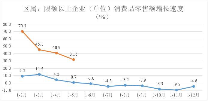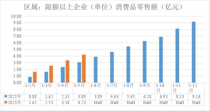 (二)区属限额以上消费品零售总额完成4.23亿元,同比增长31.6%;全口径限额以上消费品零售总额完成48.57亿元,同比增长0.5%。