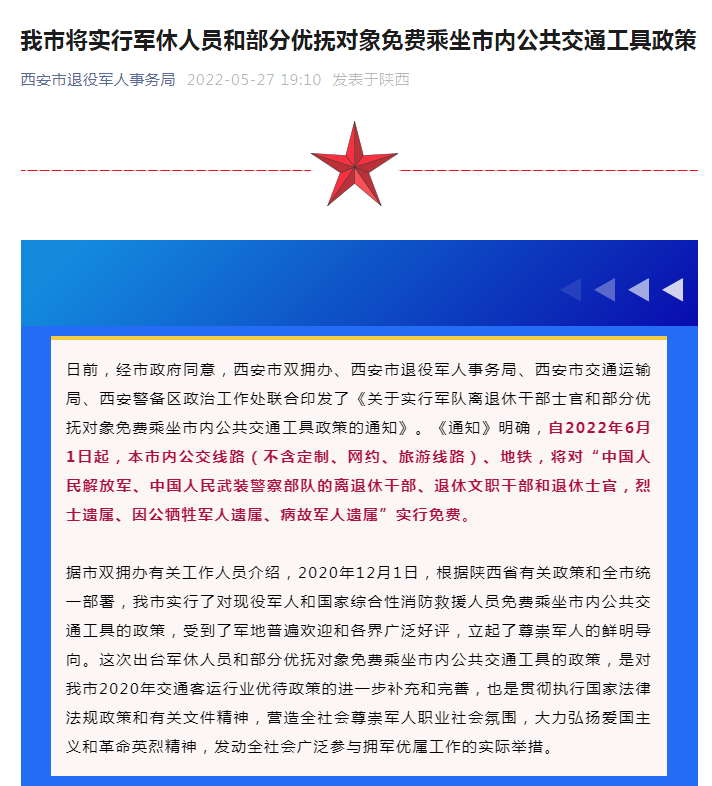 据西安市双拥办有关工作人员介绍,2020年12月1日,根据陕西省有关政策和全市统一部署,西安市实行了对现役军人和国家综合性消防救援人员免费乘坐市内公共交通工具的政策,受到了军地普遍欢迎和各界广泛好评,立起了尊崇军人的鲜明导向。这次出台军休人员和部分优抚对象免费乘坐市内公共交通工具的政策,是对西安市2020年交通客运行业优待政策的进一步补充和完善,也是贯彻执行国家法律法规政策和有关文件精神,营造全社会尊崇军人职业社会氛围,大力弘扬爱国主义和革命英烈精神,发动全社会广泛参与拥军优属工作的实际举措。