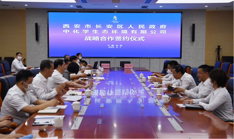6月1日,长安区与中化学生态环境有限公司举行战略合作签约仪式。区委书记吕强,区委副书记、区长李娴,副区长杨永涛,中化学生态环境有限公司总经理卢召义、副总经理李永辉,中化学生态环境有限公司西北分公司董事长刘江、总经理闫晓娇、市场营销总监赵明光出席签约仪式。区委常委、常务副区长徐超主持签约仪式。