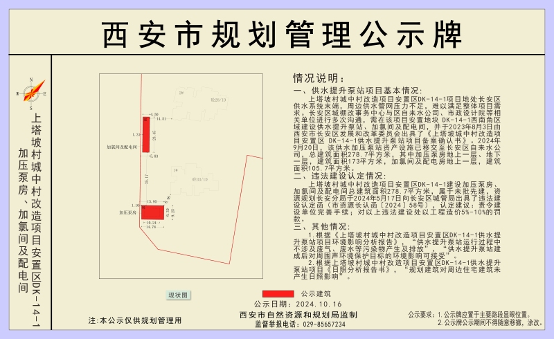 长安区上塔坡村城中村改造项目安置区DK-14-1东临长兴北路,南临韦曲西街,西临广场北路,北接西部大道,建设单位为西安市长安区城中村和棚户区改造事务中心。目前该项目正在我分局办理建设工程规划条件核实。根据《西安市自然资源和规划局关于加强建设工程规划条件核实管理工作的通知》相关规定要求,现将该项目供水提升泵站项目情况公示如下: