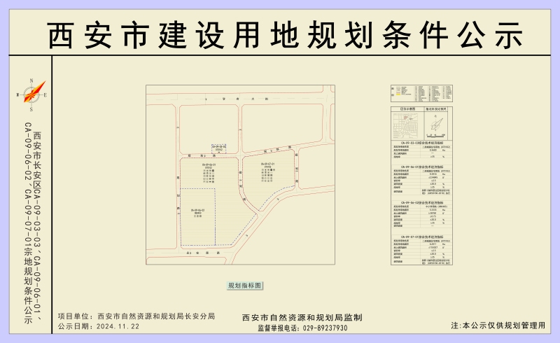 根据《西安市自然资源和规划局关于国土空间规划过渡期推进建设项目实施相关工作的指导意见(试行)》(市资源发〔2022〕97号)的精神,西安市长安区CA-09-03-03、CA-09-06-01、CA-09-06-02、CA-09-07-01已完成审议流程,现将该项目四宗地规划指标进行公示。