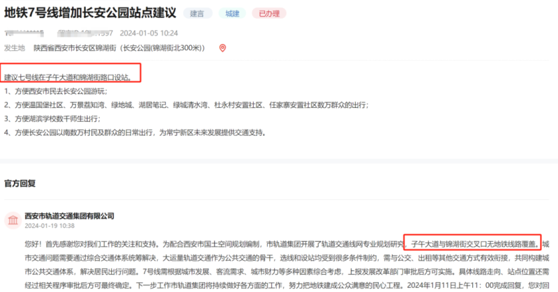 市民建议7号线在子午大道和锦湖街路口设站