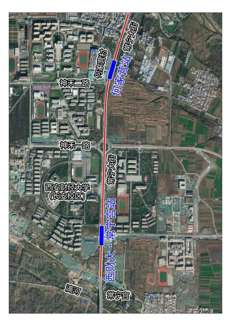 其中,北延段起于草滩北站(工程名),止于北客站,主要沿尚稷路敷设,下穿车辆段后接北客站,设2座车站;南延段起于韦曲南站,南至常宁站(工程名),线路沿南长安街-常宁大街南北向敷设,设2座车站。