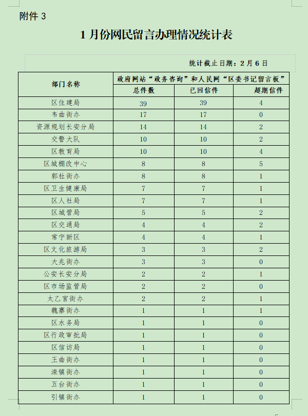 1月份,各部门、各街办通过区政府网站累计发布信息255条(附件1、附件2),区退役军人局、王曲街办发布信息数量较多,区卫生健康局、郭杜街办未发布1条工作动态信息;区政府网站和人民网区委书记留言板共受理咨询投诉153件,已回复153件,回复率100%(附件3),区教育局、区城棚改中心答复网民留言超期件较多;全区25个政务新媒体发布信息512条,推送中省市重点稿件信息55条(附件4),区司法局、区人社局、区行政审批局、引镇街办、太乙宫街办转发推送中省市重点稿件信息0条。