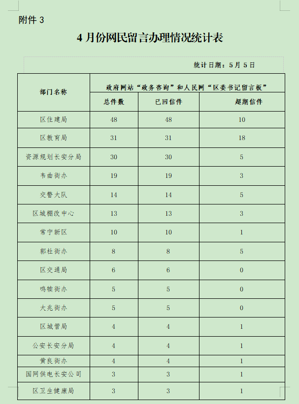 4月份,各部门、各街办通过区政府网站累计发布信息307条(附件1、附件2),区教育局、区城管局、区水务局、鸣犊街办、魏寨街办信息发布及时;区农业农村局、区金融工作中心、区城棚改中心、子午街办、引镇街办4月份发布工作信息偏少。区政府网站和人民网区委书记留言板共受理咨询投诉189件,已回复189件,回复率100%(附件3),区住建局超期件较多;全区28个政务新媒体发布信息599条,推送中省市重点稿件信息135条(附件4)。