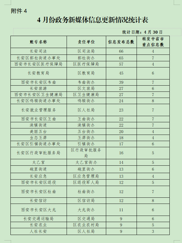 西安市长安区人民政府办公室关于2023年4月份区政府网站内容保障、网民留言办理及政务新媒体运维情况统计通报